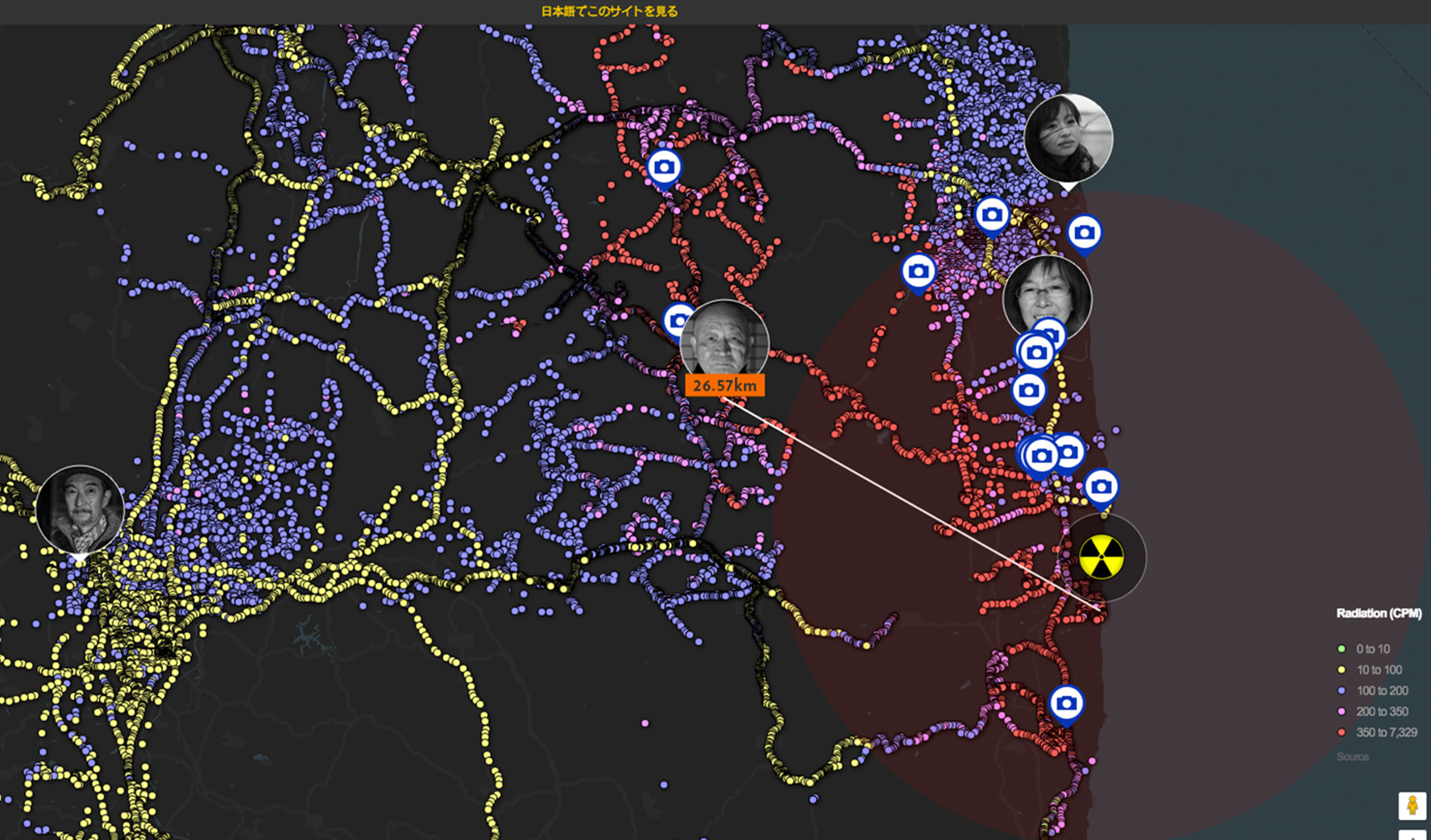 The key challenge to this project was to create a data layer over a custom Google Map displaying the spread of radiation fallout from the Fukushima nuclear plant meltdown within the context of the characters in the documentary. The data was sourced from Safecast.org (an open source raditiation data hub).