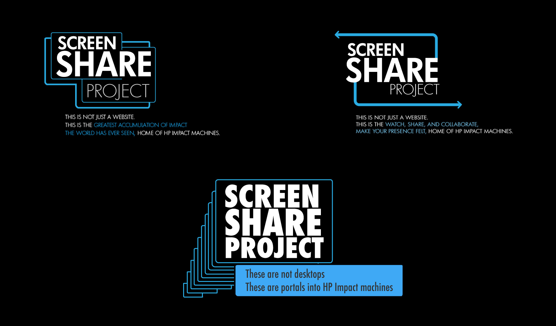 Screen Share Project is a digital platform that was at the center of the proposed advertising campaign for the launch of HPs' new line of high performance laptops. Aimed at creatives and content producers, this web application was created to give a platform for remote collaborations and crowd sourced productions, working as a mix between dribble, basecamp and github.