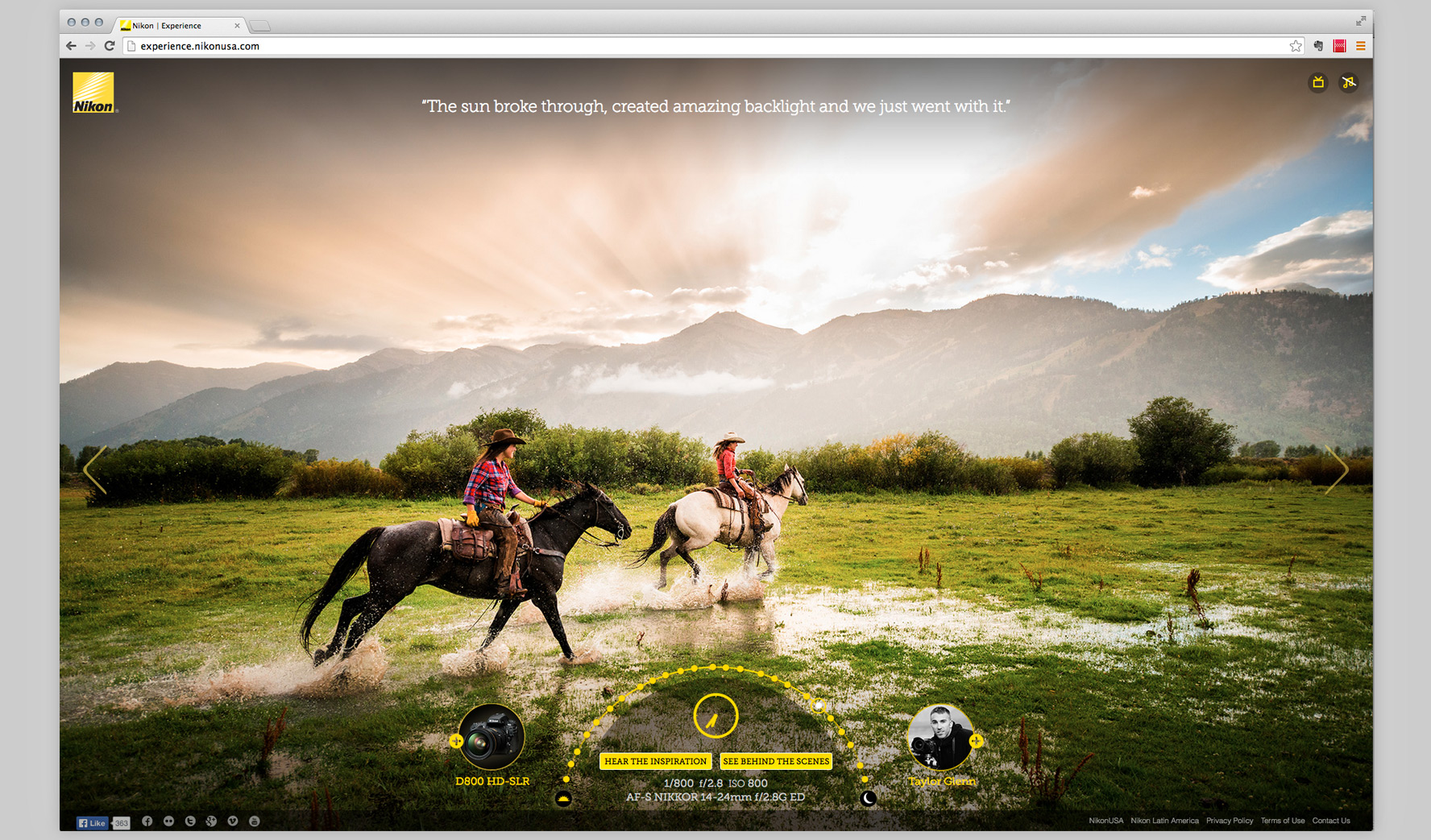 Three cameras, three photographers, three locations during the course of a day. Key challenge in this project was to design a UI thats minimal & helps to tell the story, working also as a virtual timeline. The site was designed to be viewed on a large screen, letting the photos shine, while leading one deeper into the experience of each. Visitors were given technical details about each shot, the Nikon camera that captured it, a look behind-the-scenes, audio clips from the photographer and ultimately, the inspiration for users to try it themselves. Featuring images by Corey Rich, Taylor Glenn, Troy House