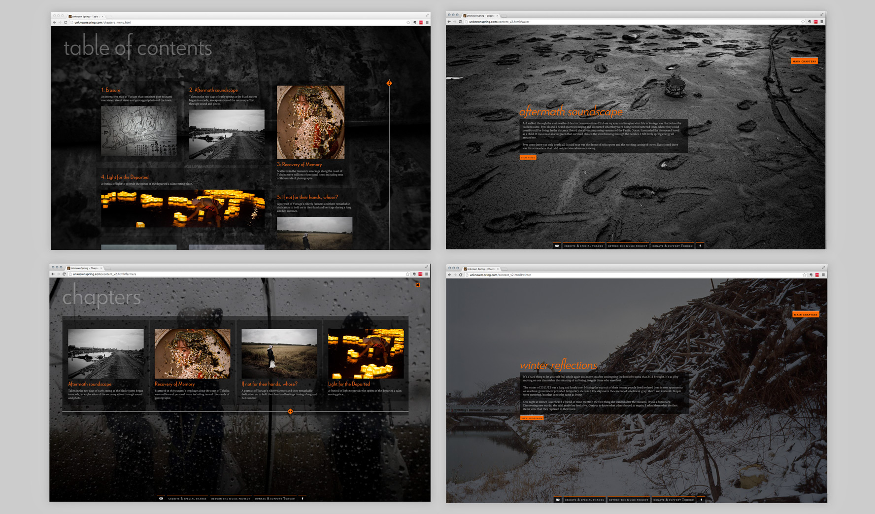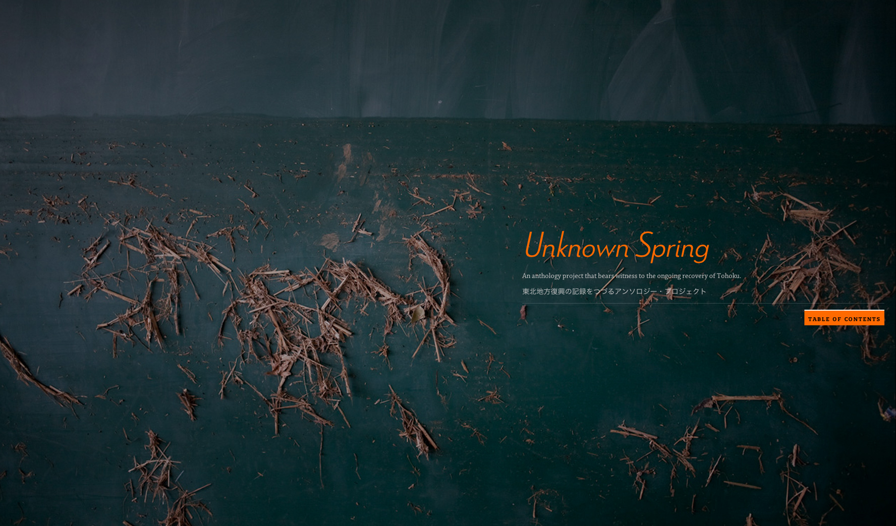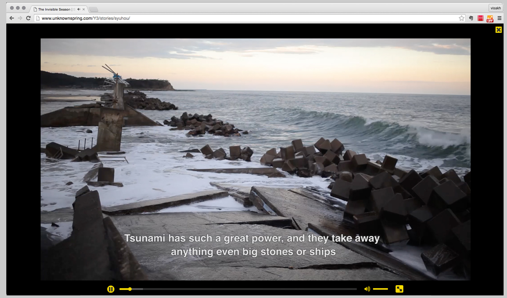 Check out the site Screening at NY Film Fest Interview at Kino-Eye POV Interactive ShortsUnknown Spring is an online anthology that chronicles a community's efforts to overcome the tsunami that struck Japan on 11 March 2011. Through interactive maps, survivor interviews, videos, and audio slideshows, this project provides a portrait of Yuriage & its residents as they try to move past their traumas and continue on with life. A collaborative project with filmmaker & photographer Jake Price