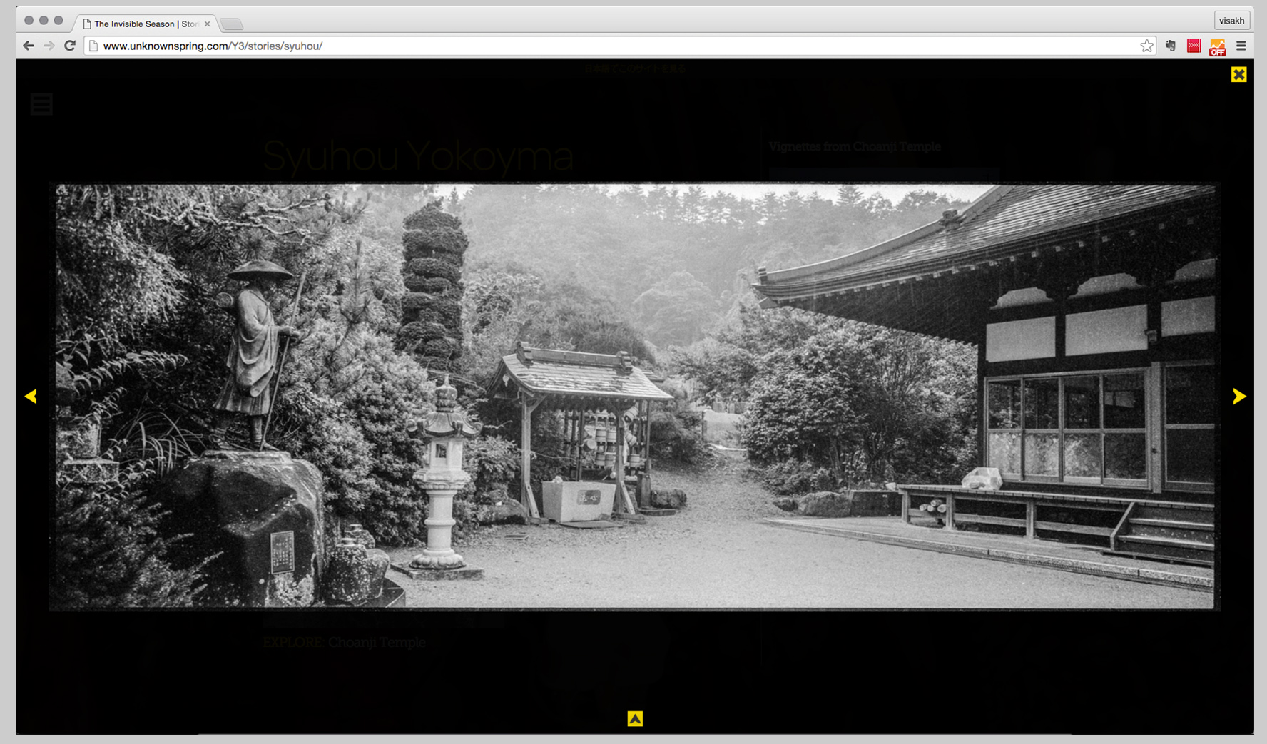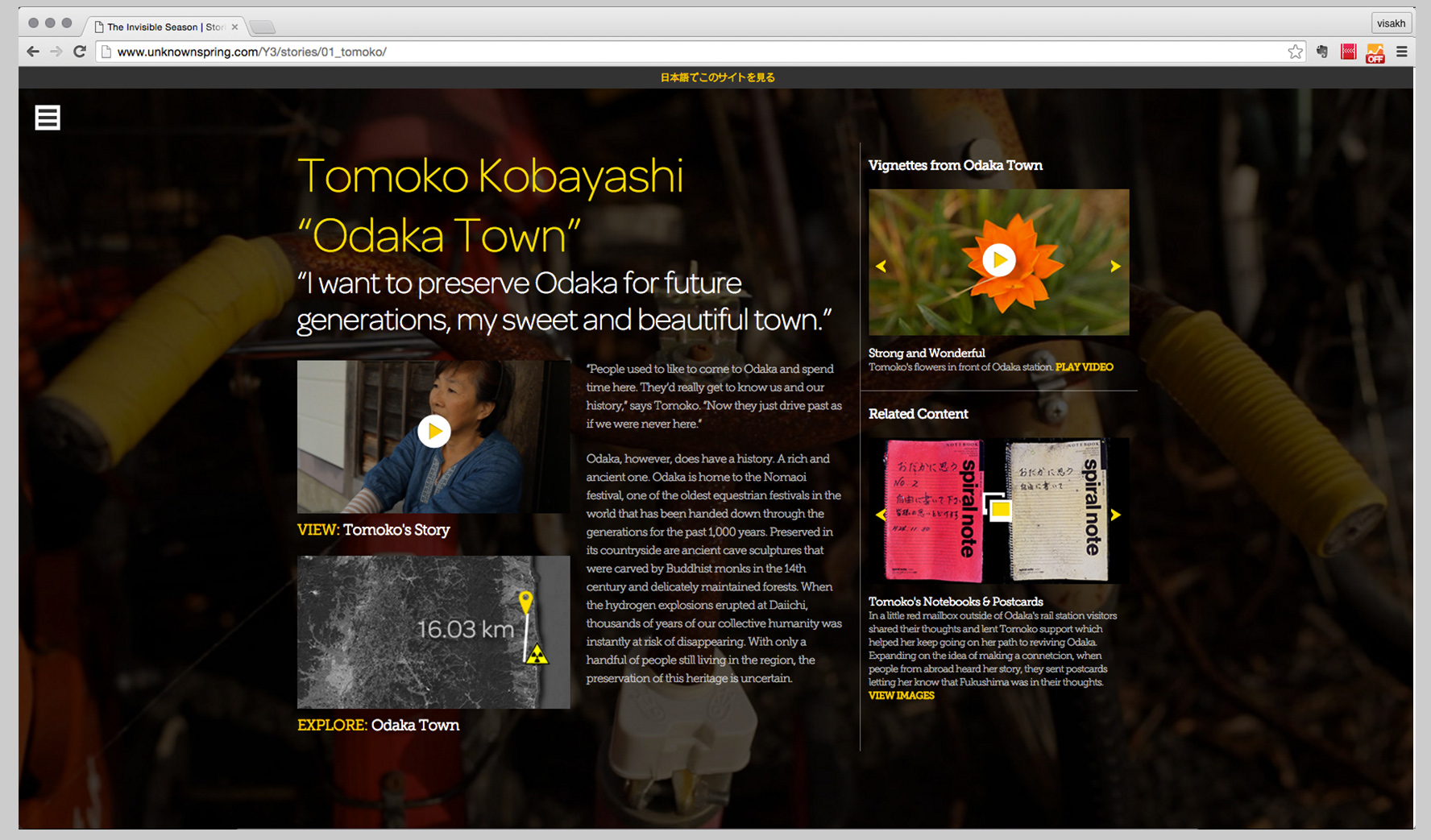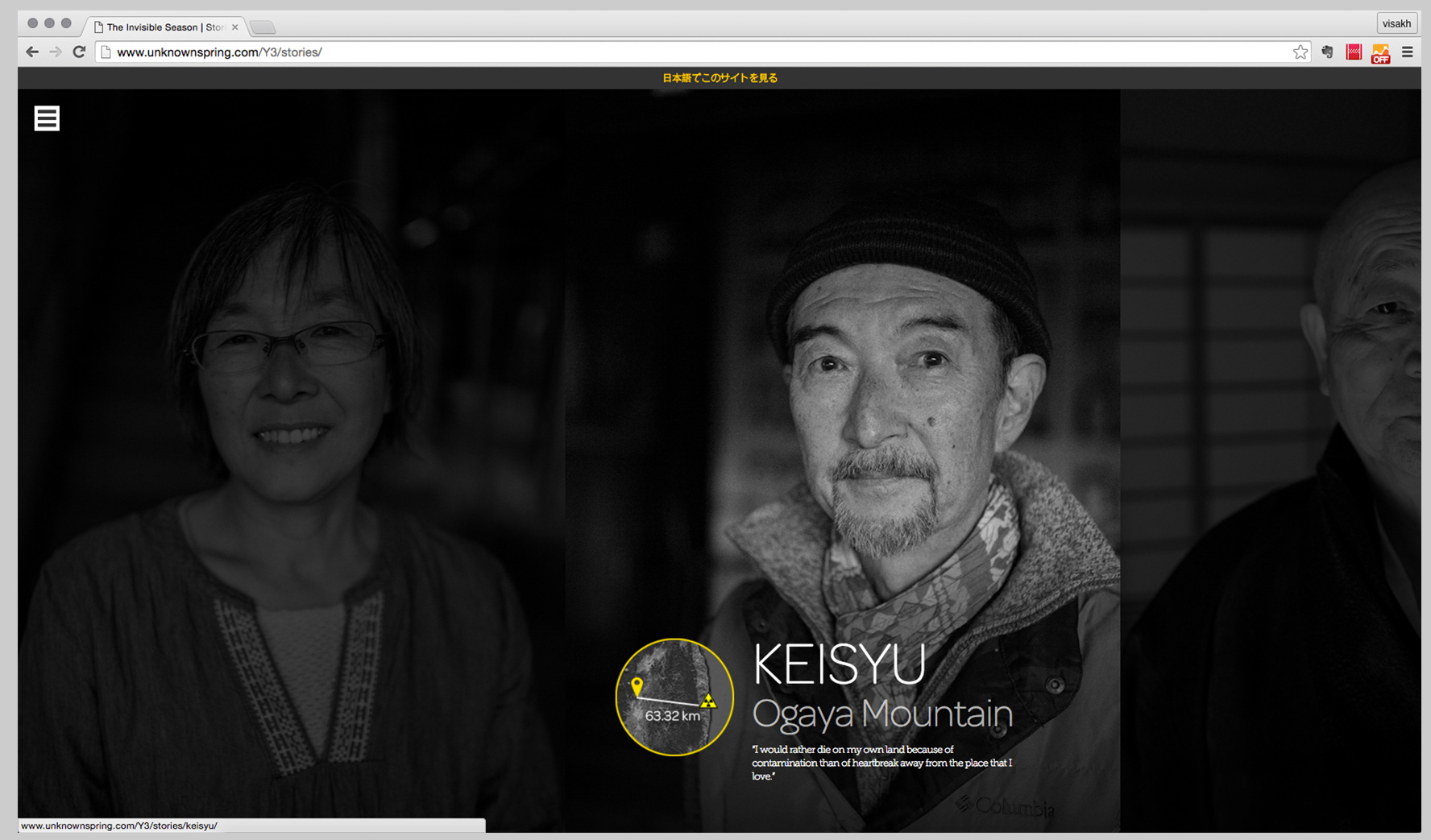 The Invisible Season is a follow up to the Unknown Spring Project, an online anthology that chronicles a community's efforts to overcome the tsunami that struck Japan on 11 March 2011. 5 years in the making, through interactive maps, survivor interviews, videos, and audio slideshows, this project provides a portrait of Yuriage & its residents as they try to move past their traumas and continue on with life.
